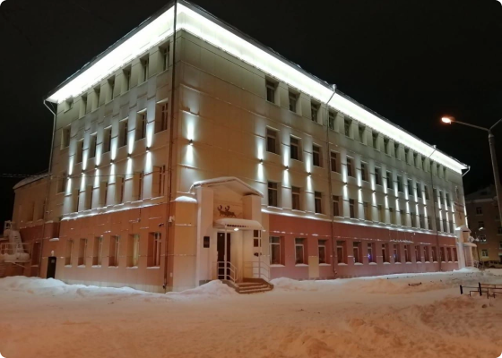 Архитектурная подсветка фасадов здания и подволоки крыши выполнена светильниками серии СП-АРХИТЕКТОР