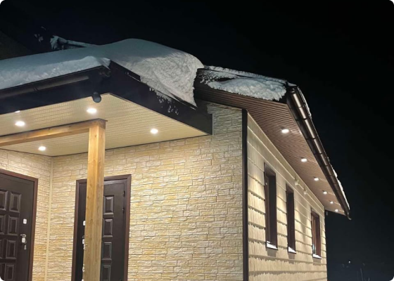 Пример использования встраиваемых светильников повышенной мощности с поворотным рефлектором для комплексной подсветки фасада и придомовой территории в деревянной коттеджном строительстве